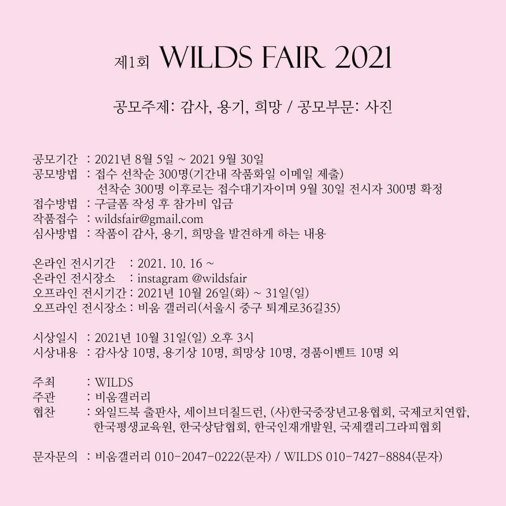 - 전시 개요 공모기간 : 2021년 8월 5일 ~ 9월 30일 온라인 전시기간 : 2021년 10월 16일 ~ 온라인 전시장소 : instagram @wildsfair 오프라인 전시기간 : 2021년 10월 26일(화) ~ 31일(일) 오프라인 전시장소 : 비움갤러리(서울 충무로) 시상식 : 2021년 10월 31일 오후 3시